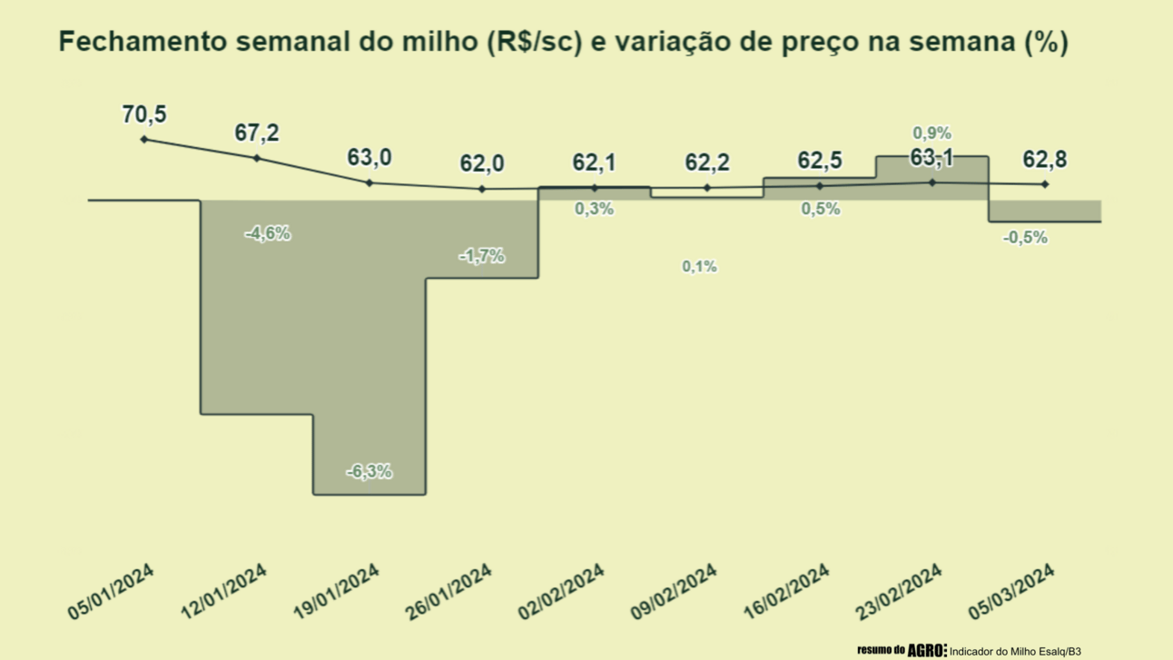 Desvalorização em Chicago: Em contraste, os futuros de milho terminaram a terça-feira em território negativo na CBOT, reagindo à desvalorização do trigo. O contrato mai/24 (CK24) recuou 0,87% e encerrou a sessão cotado em US$ 4,26/bu.
